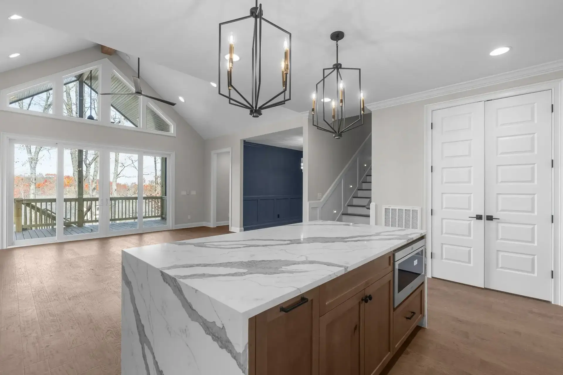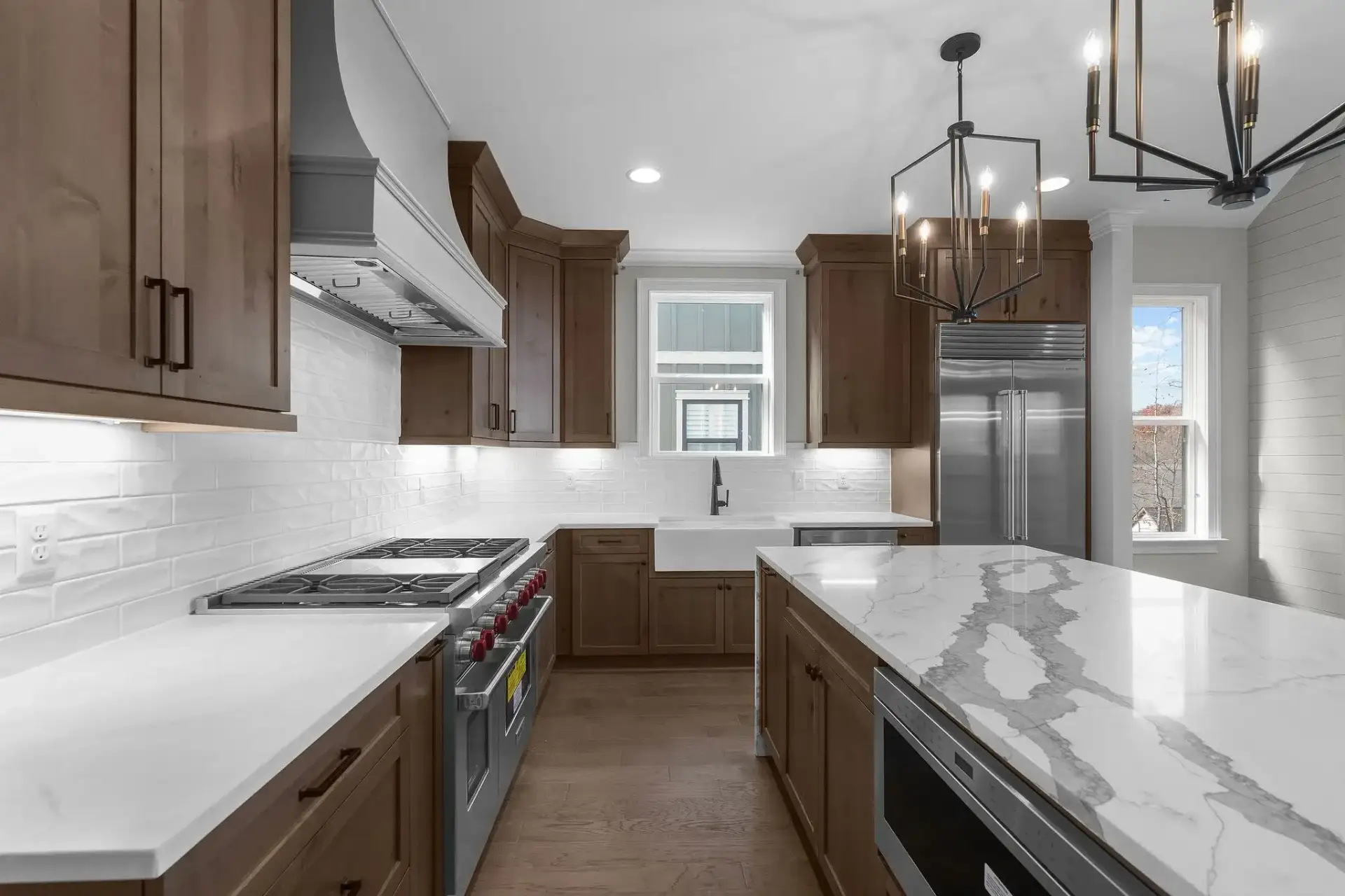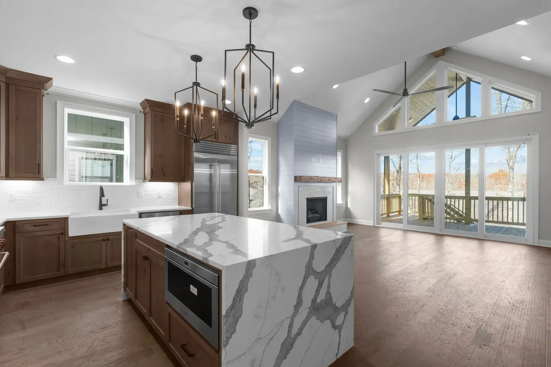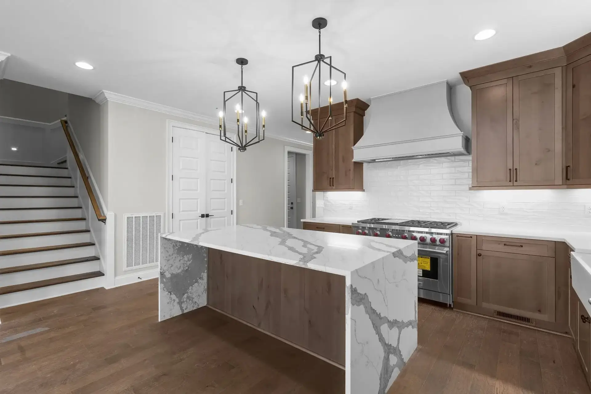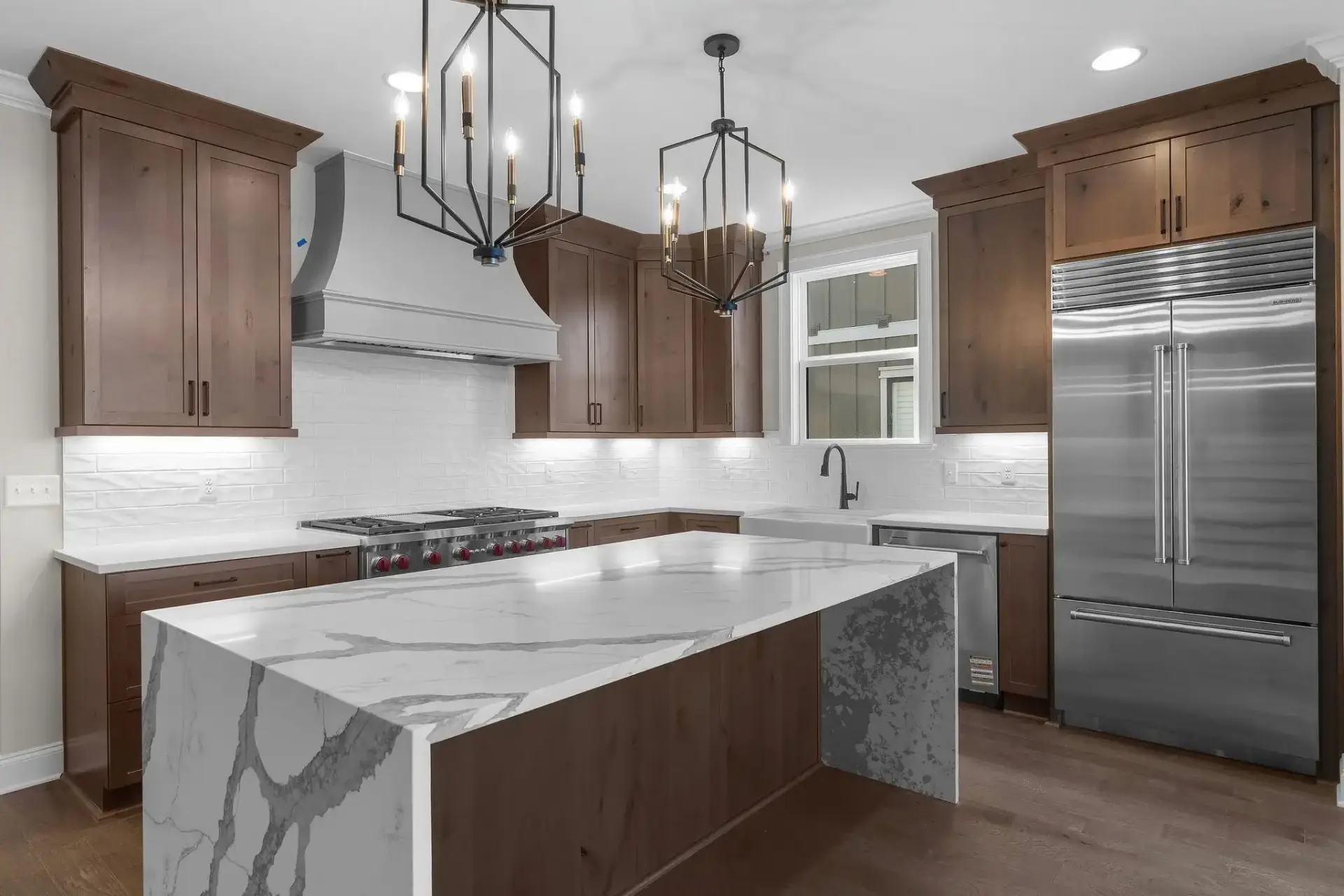 Waterfall Island Integration: Furthermore, the contrast between the medium-toned wood and the dramatic marble-veined waterfall island defines the transitional kitchen aesthetic.